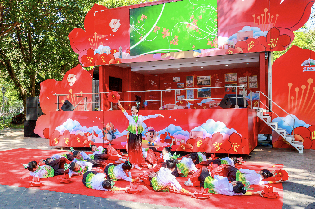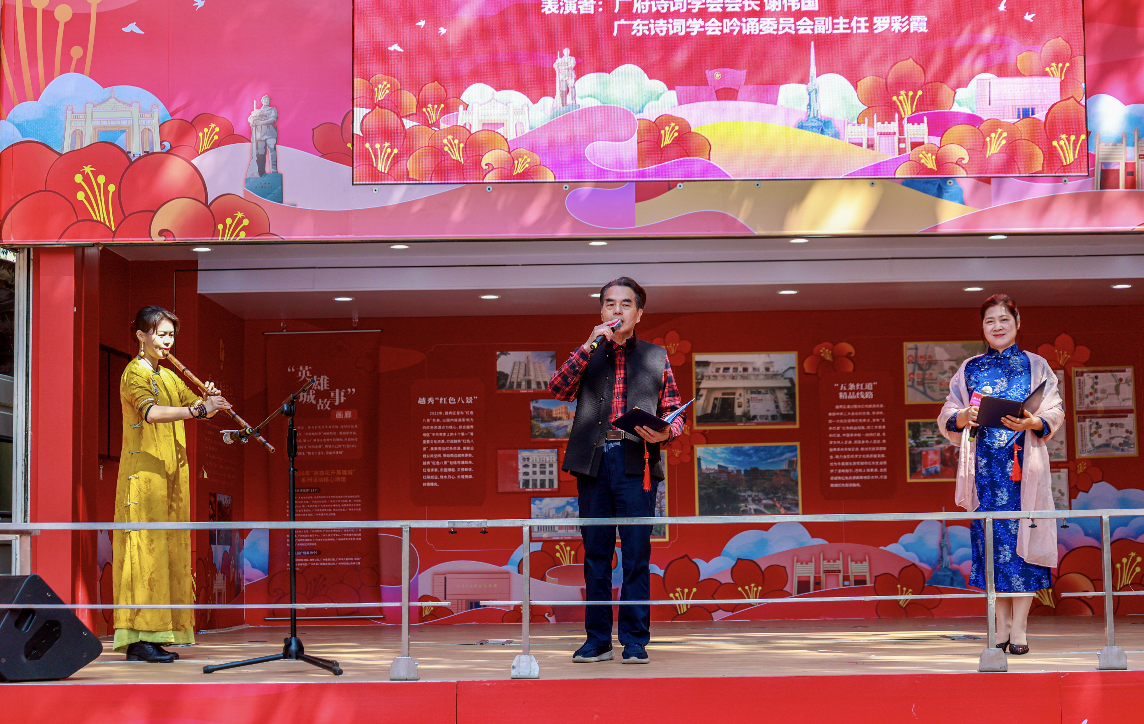 活动伊始,越秀区旧部前小学舞蹈队带来舞蹈表演《木棉花开》,用跃动的身姿展现出昂扬向上的精神风采;乐府学会吟诵研究会特聘专家谢伟国与广东诗词学会罗彩霞吟诵清代陈恭尹的《木棉花歌》,将木棉的英雄气概展现得淋漓尽致;朝天小学范配辛、周皓宁两位同学带来粤语相声《一对一》表演,用地道的广府话展现广府文化魅力;广州本土知名歌手梁山山献唱粤曲《红棉颂》以及《大湾鸡我爱你》,瞬间点燃现场气氛;最后,来自越秀区音乐协会的刘革喜和越秀区文化馆的陈敏颖用一曲《我和我的祖国》,带动全场一起大合唱,激昂的旋律与赤诚的心声交织,在会场内久久回荡……海珠广场上,一辆木棉花造型的大篷车正化身“流动舞台”,为市民送上丰富的“文化大餐”。